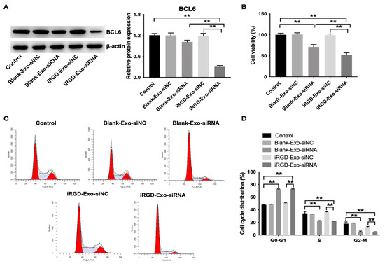 In vitro antitumor effect of iRGD-Exos-BCL6 siRNA. (A) Western blot analysis of BCL6 expressions in OCI-Ly8 cells. (B) CCK-8 assay was used to detect cell proliferation. (C,D) Flow cytometry assay was used to detected cell cycle distribution. ** p < 0.01. All tests were repeated in triplicate [55].