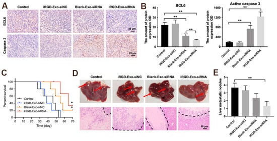 Tissue analyses. (A,B) IHC analysis of BCL6 and active caspase 3 expressions in tumor tissues collected from nude mice injected with OCI-Ly8 cells and exosomes via tail vein (scale bar, 25 μm). IOD, integrated optical density. (C) The survival rate of mice is shown. (D,E) Representative images of tumor burdened liver tissues and their HE-stained sections. Red arrows, metastasis nodules in liver tissues. White section, tumor nodules. * p < 0.05, ** p < 0.01 [55].