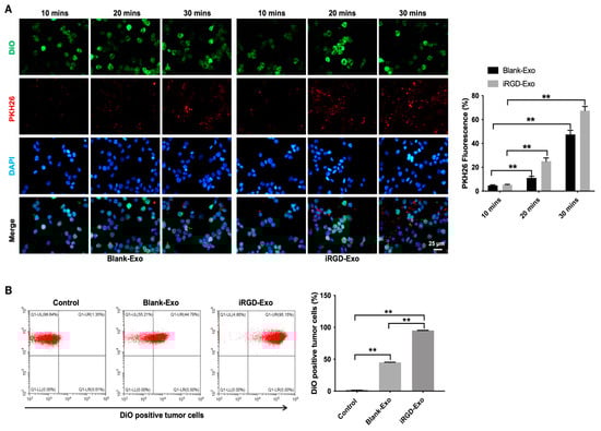 Targeting DLBCL cells via iRGD-Exo. (A) Confocal microscopy images of colocalization of exosomes in OCI-Ly8 cells. The nucleus was stained with DAPI (blue), the cell membrane was stained with DiO (green), and exosomes were labeled with PKH26 (red). Scale bar, 25 μm. (B) Flow cytometry analysis of the proportion of OCI-Ly8 cells that were bound to iRGD-Exo. ** p < 0.01. All tests were repeated in triplicate [55].