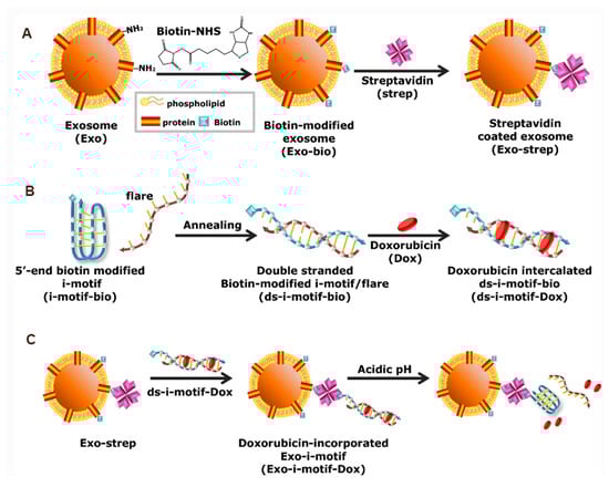 Schematic illustration of (A) preparation of biotin-modified exosomes (Exo-bio) and streptavidin-coated exosomes (Exo-strep). (B) Intercalation of Dox within double-stranded DNA composed of the biotin-modified I-motif (i-motif-bio) and flare (ds-i-motif-bio). (C) Complexation of Exo-bio-strep-ds-i-motif-bio (Exo-i-motif) and incorporation of Dox for pH-responsive delivery of Dox [73].