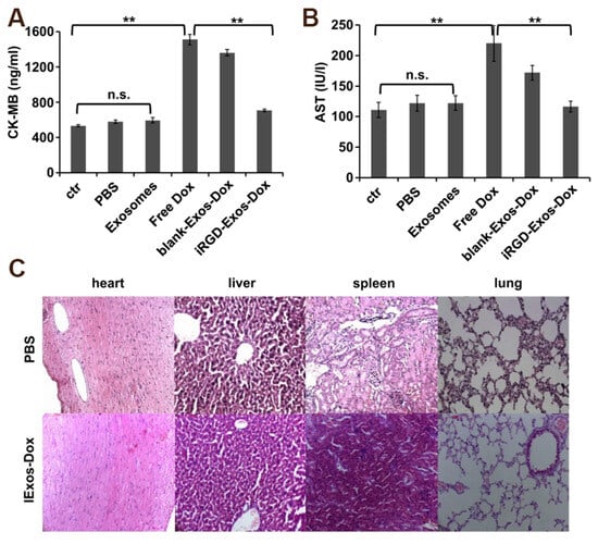 Evaluation of the toxicity profile of iRGD-Exos-Dox. (A,B) Serum markers of cardiac damage. Serum was collected from tumor-bearing mice treated with six injections of PBS, iRGD-Exos, Free Dox (3 mg/kg), or an equivalent amount of Dox incorporated into blank-Exos (blank-Exos-Dox) or iRGD-Exos (iRGD-Exos-Dox), and the activities of CK-MB (A) and AST (https://www.sciencedirect.com/topics/biochemistry-genetics-and-molecular-biology/aspartate-transaminase) (accessed on 27 January 2025). (B) were measured. Each bar represents mean ± SD of three replicates. n.s., not significant; **, p < 0.01. (C) Various organs from mice treated as described in (A,B) were stained with H&E. No overt tissue damage was observed in iRGD-Exos-Dox treated mice [57].