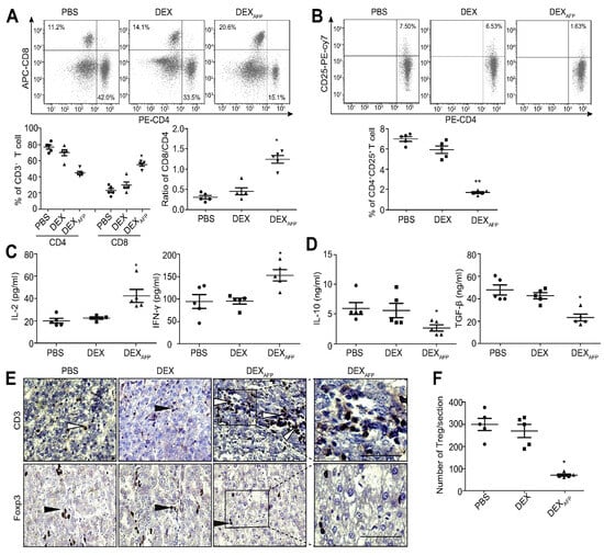 DC-EXOAFP (DEXAFP) improved the tumor microenvironment (https://www.sciencedirect.com/topics/pharmacology-toxicology-and-pharmaceutical-science/tumor-microenvironment) (accessed on 27 January 2025) in DENA-induced autochthonous HCC mice. (A) Analysis of CD8CD3 (https://www.sciencedirect.com/topics/immunology-and-microbiology/cd3-antigen) (accessed on 27 January 2025) and CD4CD3 T lymphocytes in tumor tissues from treated tumor-bearing mice. (B) Flow cytometry analysis of CD25CD4 (https://www.sciencedirect.com/topics/biochemistry-genetics-and-molecular-biology/cd25) (accessed on 27 January 2025) Treg (https://www.sciencedirect.com/topics/immunology-and-microbiology/regulatory-t-cell) (accessed on 27 January 2025) cells in tumor tissues from treated tumor-bearing mice. (C) Measurement of IFN-γ and IL-2 in tumor tissues from treated tumor-bearing mice on week 40 after induction. (D) Measurement of TGF-β and IL-10 in tumor tissues from treated mice with ELISA. (E) Immunohistochemistry (https://www.sciencedirect.com/topics/medicine-and-dentistry/immunohistochemistry) (accessed on 27 January 2025) of CD3 and FoxP3 Treg cells in tumor sections from treated autochthonous HCC mice (scale bar = 100 μm). (F) Quantitative analysis (https://www.sciencedirect.com/topics/biochemistry-genetics-and-molecular-biology/quantitative-technique) (accessed on 27 January 2025) of FoxP3 Treg cells in tumor tissues from treated autochthonous HCC mice. Significance was determined with two-tailed t test (* p < 0.05; ** p < 0.01) [93].