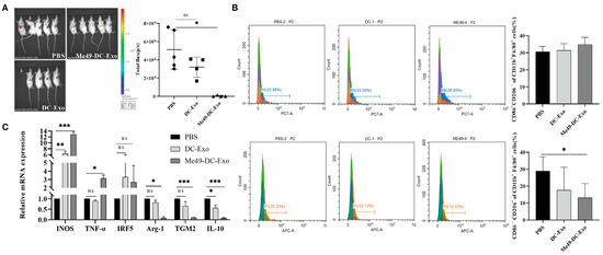 Me49-DC-Exo inhibited tumor growth in mice and regulated macrophage polarization. (A) On Day 4 after treatment, the IVIS imager detected bioluminescence images in tumors of mouse and quantified the bioluminescence signal intensity of each tumor in mouse. (B) Flow cytometry was used to label CD86 + or CD206 +, and CD45 + CD11b + F4/80 + macrophages in blood of mice injected with DC-Exo and Me49-DC-Exo were stained to detect the percentage of CD86+ CD206 − M1 macrophages and CD86 − CD206 + M2 macrophages. (C) mRNA levels of M1 macrophage specific genes and M2 macrophage specific genes in blood of tumor-bearing mice injected intratumorally with PBS, DC-Exo, and Me49-DC-Exo were detected by qRT-PCR. n.s., not significant (p ≥ 0.05), * p < 0.05, ** p < 0.01, *** p < 0.001 [97].