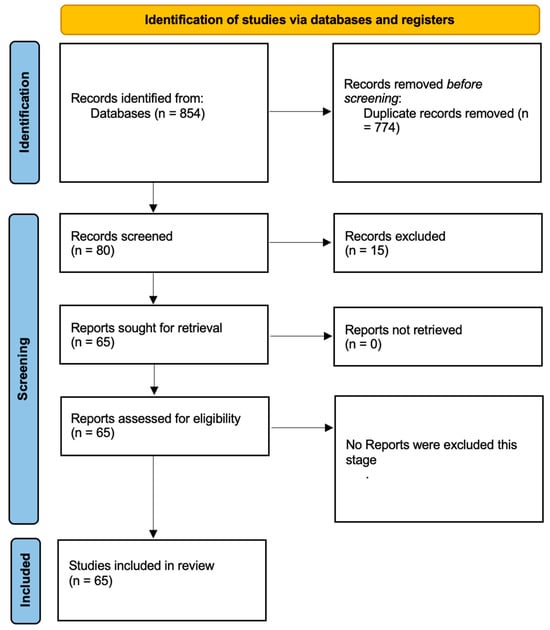 Figure 2 illustrates the study selection process in accordance with PRISMA guidelines [15]. The initial database search across PubMed, Embase, and Scopus yielded 854 unique records after deduplication. Titles and abstracts were then screened against the inclusion and exclusion criteria outlined in Table 2, resulting in a subset of potentially relevant articles that underwent full-text evaluation. Ultimately, 65 articles satisfied the eligibility requirements and were included in this review.