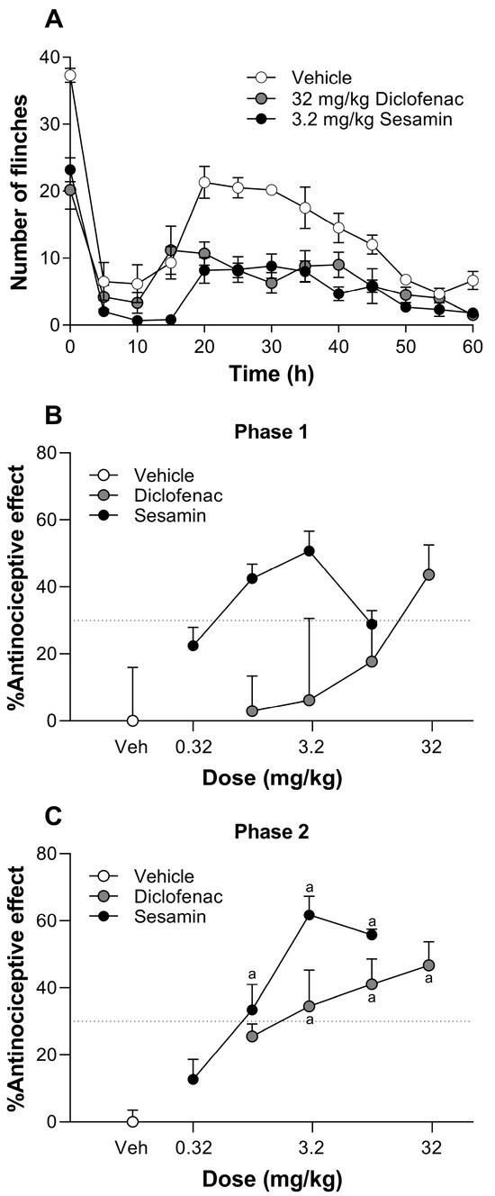 (A) The time course of the antinociceptive effect observed after the oral administration of sesamin (3.2 mg/kg) or diclofenac (32 mg/kg) in rats subjected to a subcutaneous injection of 1% formalin. (B,C) The dose–response curves of sesamin (0.32–10 mg/kg) and diclofenac (1–32 mg/kg) obtained during phase 1 and phase 2 of the formalin test in rats. The data are expressed as the mean ± S.E.M. from six rats per experimental group. (a) Significantly different from vehicle group (Veh) according to analysis of variance (ANOVA), followed by Tukey’s test.