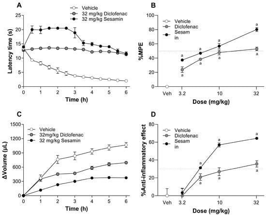 (A,C) The time course of the antihyperalgesic and anti-inflammatory effects observed after the oral administration of sesamin (32 mg/kg) or diclofenac (32 mg/kg) in rats subjected to an intraplantar injection of 1% carrageenan. (B,D) Dose–response curves obtained from the antihyperalgesic and anti-inflammatory effects induced by increasing oral doses of sesamin (3.2–32 mg/kg) or diclofenac (3.2–32 mg/kg) in rats subjected to an intraplanar injection of 1% carrageenan. Data are expressed as the mean ± S.E.M. from 6–8 rats per experimental group. (a) Significantly different from vehicle group (Veh) according to analysis of variance (ANOVA), followed by Tukey’s test.