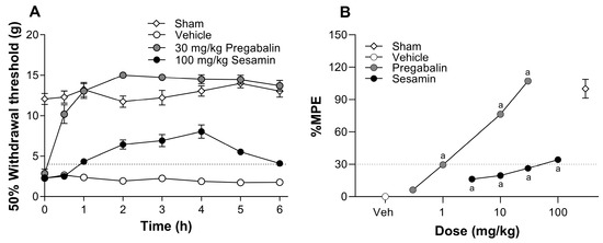 Rats subjected to spinal nerve L5/L6 ligation showed reductions in the 50% withdrawal threshold to values less than 4 g, which was interpreted as tactile allodynia. In contrast, sham-operated rats maintained their 50% withdrawal threshold at values around 12 g. Allodynia was present in the rats from the first day following spinal surgery and persisted for at least 14 days, when the drugs were administered. The oral administration of 100 mg/kg sesamin slightly increased the 50% withdrawal threshold with a maximal antiallodynic effect at about 4h; then, the effect progressively decreased to basal values after 6 h. For its part, the oral administration of 30 mg/kg pregabalin gradually increased the 50% withdrawal threshold until achieving its maximum effect at around 2 h; then, the effect lasted for at least 6 h (Figure 3A). The oral administration of increasing doses of sesamin (3–100 mg/kg) resulted in a moderate dose–dependent antiallodynic effect. Conversely, oral pregabalin (0.3–30 mg/kg) dose-dependently increased its antiallodynic effect until reaching values close to 100% effect. In this model of neuropathic pain, pregabalin was clearly more effective (p ˂ 0.001) and potent (p ˂ 0.001) than sesamin, because pregabalin had an efficacy of 107 ± 1.6% and an ED30 = 9.8 ± 1.9 mg/kg, whereas sesamin presented an efficacy of 34.3 ± 2.0% and an ED30 = 56.5 ± 2.2 mg/kg. Both drugs were significantly different to the vehicle group in the tested dose range (Figure 3B).