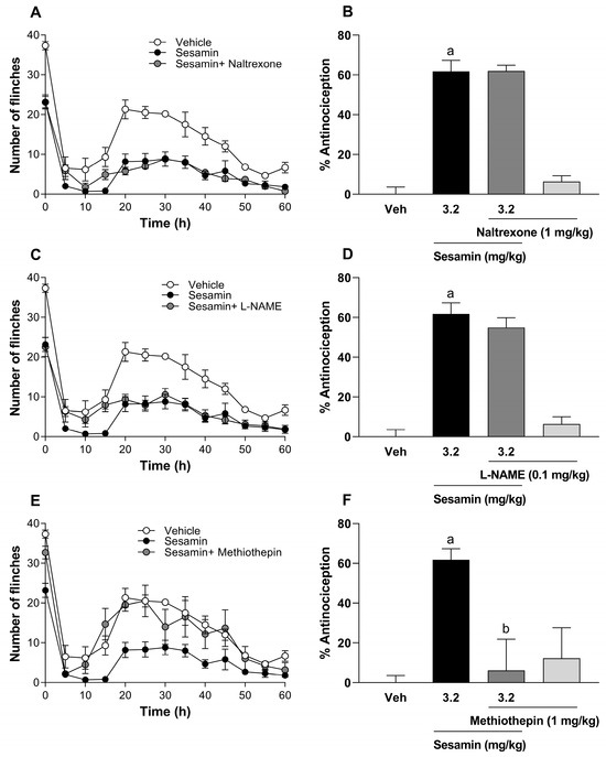 (A,C,E) The time courses of the antinociceptive effect observed after the oral administration of sesamin alone, sesamin and naltrexone, sesamin and L-NAME, or sesamin and methiothepin in the formalin test. (B,D,F) The effect of the intraperitoneal administration of naltrexone (1 mg/kg, −30 min), L-NAME (0.1 mg/kg, −30 min), or methiothepin (1 mg/kg, −30 min) on sesamin (3.2 mg/kg, −60 min)-induced antinociception in phase 2 of the formalin test. Bars are the mean ± S.E.M. from six rats per experimental group. (a) Significantly different from vehicle group (Veh); (b) significantly different from sesamin group via analysis of variance (ANOVA), followed by Tukey’s test.