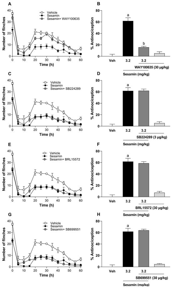(A,C,E,G) The time courses of the antinociceptive effect observed after the oral administration of sesamin alone, sesamin and WAY100635, sesamin and SB224289, sesamin and BRL15572, or sesamin and SB699551 in the formalin test. (B,D,F,H) The effect of the intraperitoneal administration of WAY100635 (30 μg/kg, -30 min), SB224289 (3 μg/kg, -30 min), BRL15572 (30 μg/kg, -30 min), or SB699551 (30 μg/kg, -30 min) on sesamin (3.2 mg/kg, -60 min)-induced antinociception in phase 2 of the formalin test. Bars are the mean ± S.E.M. from six rats per experimental group. (a) Significantly different from the vehicle group (Veh); (b) significantly different from the sesamin group via analysis of variance (ANOVA), followed by Tukey’s test.