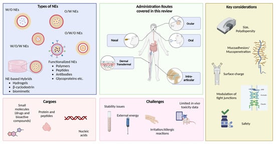 Graphical summary of NEs in drug delivery, illustrating different NE types, encapsulated cargoes, administration routes, and key challenges and considerations for effective formulation and application, as covered in this review. Created in BioRender. Mitsou, E. (2025) https://BioRender.com/v69p693, accessed on 1 January 2025.