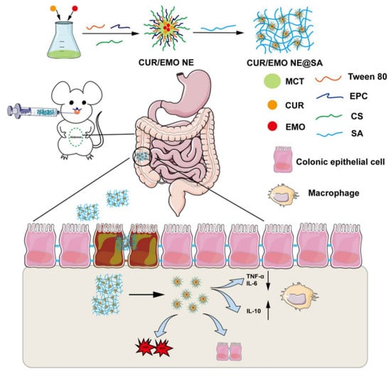 Schematic of preparing curcumin/emodin (CUR/EMO) NE by high-energy emulsification and using the physical cross-linking of chitosan and sodium alginate (SA) for CUR/EMO NE@SA, as well as demonstrating the advantages of CUR/EMO NE@SA in alleviating inflammatory bowel disease (IBD). Obtained under the terms of the Creative Commons CC BY license from [].