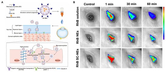 (A) Schematic representation of a stearoyl L-carnitine-modified NEs (SC-NEs) for the ocular delivery of dexamethasone along with the proposed transport mechanisms for SC-NEs in human corneal epithelial cells (HCECs). SC-NEs and Na+/Cl- bind to the specific sites of OCTN2 and ATB0,+, and the transporters change their conformation from outward-facing to a stable occluded state, triggering membrane invagination and clathrin- and caveolin-medicated endocytosis process. In addition, macropinocytosis and caveolin and clathrin-independent pathway are also involved in the cellular uptake and transport of SC-Nes. (B) Ocular surface retention study of SC-NEs in rabbit eyes. Fluorescence images of rabbit eyes after topical instillation of rhodamine B (RhB) solution, RhB NEs, and RhB 10% SC-NEs at different time points. Obtained under the terms of the Creative Commons CC BY license from [].