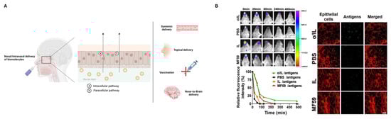 (A) Schematic representation of the routes of intranasal drug delivery and its application. Created in BioRender. Mitsou, E. (2025) https://BioRender.com/n01l841, accessed on 1 January 2025. (B) Oil-in-ionic liquid NE-based intranasal delivery system for influenza split-virus vaccine and the determination of antigen deposition and permeation in the nasal cavity. In vivo fluorescent images and the semiquantitative analysis of the relative fluorescence intensity of Cy7-SE-labeled antigens in the nasal cavities of immunized mice at different time intervals after the intranasal administration of antigens in different formulations. Confocal laser scanning microscopy images of nasal epithelia at 1 h post-intranasal administration of Cy5-labeled antigens formulated in different vaccine delivery systems. Obtained with permission from [].