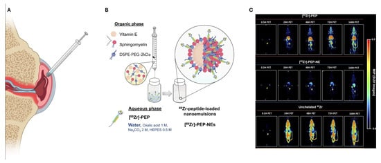 In addition to their targeting properties, peptides can act also as drugs but, most importantly, can be used as platforms for modifying NEs into theranostic systems. A senolytic peptide (PEP; eliminates or suppresses senescent cells in joints) has been used for the active targeting of chondrocytes and as a new strategy for imaging purposes. The nuclear imaging technique, positron emission tomography (PET), was used for the highly sensitive monitoring of the NE system’s biodistribution, demonstrating its potential as a theranostic tool. The NE system, prepared using an ethanolic injection method, consisted of vitamin E, sphingomyelin, and a PEG lipid, with a particle size of 145 nm and a positive charge of +19 mV. The system remained stable in terms of size in both human plasma and synovial fluid over a one-week period. The peptide was attached through a maleimide-cysteine linkage with C18-PEG6, with radiolabeling occurring at the end of the peptide to ensure exposure. In this study, normal rats received IA injections of the modified NEs, which showed that zirconium-89 (⁸⁹Zr)-PEP was quickly distributed throughout the body, while [⁸⁹Zr]-PEP-NE was retained at the injection site for longer, with reduced accumulation in the liver and kidneys due to prolonged joint retention. Although the primary purpose of this study was to examine biodistribution, the technique holds significant promise for the early detection of joint diseases before severe symptoms appear by employing peptide radiolabeling with the isotope ⁸⁹Zr (Figure 6). This research lays the foundation for developing imaging NEs for osteoarthritis and other joint diseases [].