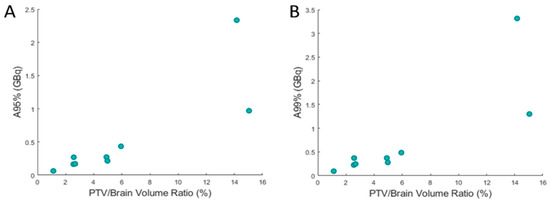 Figure 1A,B show the prescribed 90Y-PVA-MB activities (i.e., A95% and A99%) versus the PTV/normal brain volume ratio, respectively.
