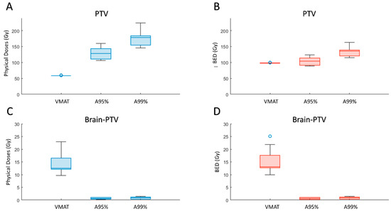 Boxplot of the mean physical doses delivered to the (A) PTV and (C) Brain-PTV, and the mean BED delivered to the (B) PTV and (D) Brain-PTV.