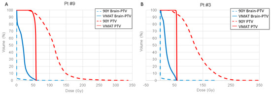 DVHs of the PTV and Brain-PTV for patient #9 with an intermediate target volume (A) and patient #3 associated with the highest calculated 90Y-PVA-MB activity (B). Both of the DVHs were normalized to achieve a 95% coverage of the PTV volume, assuming an injection corresponding to A95% with the 90Y-PVA-MBs.