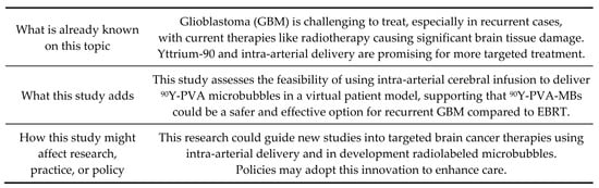 Similarly, in the current study, we used the method employed by Chen et al. [27] and merged preoperative anatomical MR images with real-time perfusion images to identify the vascular supply to GBM tumors. We then used a custom tool to calculate the absorbed dose distribution from contrast-enhanced MRI images, which served as a surrogate for the 90Y-PVA-MB distribution, to investigate the in silico feasibility and safety of the IACI injection of 90Y-PVA-MBs to treat patients with recurrent GBM. Our second objective was to compare the 90Y-PVA-MB dose distribution with the one calculated using the EBRT approach to assess the equivalent activity required to meet the absorbed dose thresholds for organs at risk (OARs). The key messages are summarized in Scheme 1.
