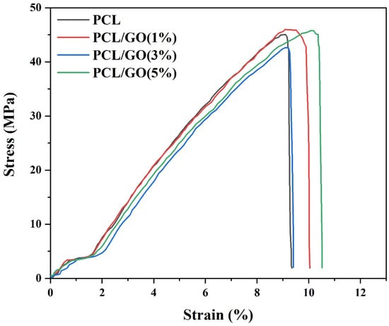 Stress–strain curves of 3D-printed PCL and PCL/GO meniscus scaffolds with varying GO concentrations (1%, 3%, and 5%).