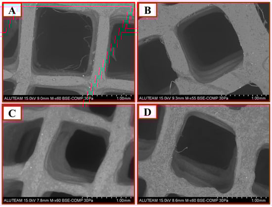 According to morphological analyses of the PCL scaffold, the pores (pore sizes ~1 mm) were observed as a regular and homogeneous structure (Figure 2A). The uniform surface morphology reflects the high workability and controllable properties of pure PCL. In the PCL/GO (1%) scaffold, slight irregularity was observed on the surface with GO doping (Figure 2B). This may improve biocompatibility and cell adhesion. The pore structure (pore size ~2 mm) is regular, but a more pronounced heterogeneity is observed in the walls. This change in the surface may slightly increase mechanical strength while creating a more favorable environment for biological integration. The PCL/GO (3%) scaffold showed more pronounced microstructural irregularities on the surface with an increasing GO content (Figure 2C). The connections between the pores appear sharper and clearer, which may provide favorable effects on mechanical load bearing. The pore sizes remained constant at about 1 mm, but the shape of the pores gained a sharper and more distinct geometry. This can improve the structure stability and the favorable environment for the arrangement of cells. The 5% GO doping created significant irregularity on the surface (Figure 2D). This may favorably affect the attachment and proliferation of cells to the scaffold. However, excessive surface modifications may cause weaknesses in mechanical strength. Pore sizes increased to around 2 mm, and irregularities in the pore walls increased. The density of micro- and nanoscale structures on the surface may give positive results regarding biological performance. As the GO ratio increases in 3D meniscus scaffold design, a noticeable change in surface morphology occurs. This benefits cell attachment, proliferation, and biological integration [34].