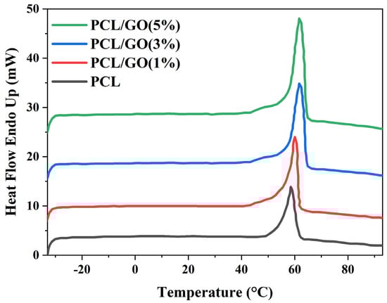 Differential scanning calorimetry curves of 3D-printed PCL and PCL/GO meniscus scaffolds with varying GO concentrations (1%, 3%, and 5%).