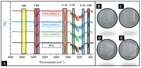 (A) FTIR spectrums of PCL and PCL/GO meniscus scaffolds with varying GO concentrations (1%, 3%, and 5%), (B) PCL 3D printed (12 layers), (C) PCL/GO (1%) 3D printed (12 layers), (D) PCL/GO (3%) 3D printed (12 layers), (E) PCL/GO (5%) 3D printed (12 layers).