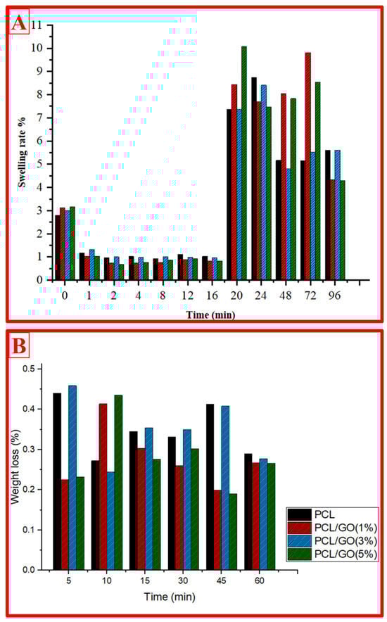 The swelling behavior of PCL and PCL/GO composites (1%, 3%, and 5%) is expressed as a function of time (Figure 5A). Initially, the swelling rate of the PCL scaffold remains at lower levels compared to the GO-reinforced composite scaffolds. This can be interpreted as GO increases the water absorption capacity due to its hydrophilic nature. A significant swelling increase is observed in all samples, especially from 24 min onwards, and reaches a plateau level at 72–96 min. However, as the percentage of GO increases, the increase in the swelling rate becomes more pronounced. This indicates that the homogeneous distribution of GO in the polymer matrix and the hydrogen bonds formed between GO and polymer attract water more effectively [43,44].