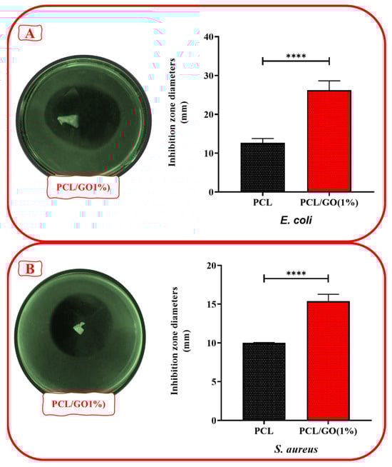 The PCL/GO (1%) scaffold showed a pronounced antibacterial effect on E. coli (Figure 6A). The 26.21 mm inhibitory zone was much larger than the 12.65 mm zone provided by PCL alone. GO was observed to potentiate the antibacterial properties of PCL. This showed that it provides a much more effective solution against Gram-negative bacteria. This is because GO’s surface properties and load-carrying capacities can enhance antibacterial properties by acting on the bacterial cell wall. The PCL/GO (1%) combination also showed a stronger effect on S. aureus (Figure 6B), but this effect was not as pronounced as against E. coli. The inhibitory zone of 15.38 mm is larger than the PCL effect of 10.01 mm. Similar studies have shown that GO into PCL scaffolds improves their antimicrobial properties. In one study, PCL incorporated with reduced graphene oxide (rGO) was found to exhibit potent antibacterial activity against both Gram-positive (S. aureus) and Gram-negative bacteria (E. coli), and higher concentrations of rGO-enhanced bacteriostatic effects [50]. In another study, electroactive PCL scaffolds with thermally reduced graphene oxide (TrGO) showed complete eradication of S. aureus under electrical stimulation, highlighting the potential of combining electroactive and antibacterial properties for enhanced tissue regeneration [51]. These findings support the idea that the incorporation of GO-doped PCL scaffolds not only supports tissue regeneration but also mitigates bacterial growth, which is crucial for preventing infections in medical applications like meniscus implants.
