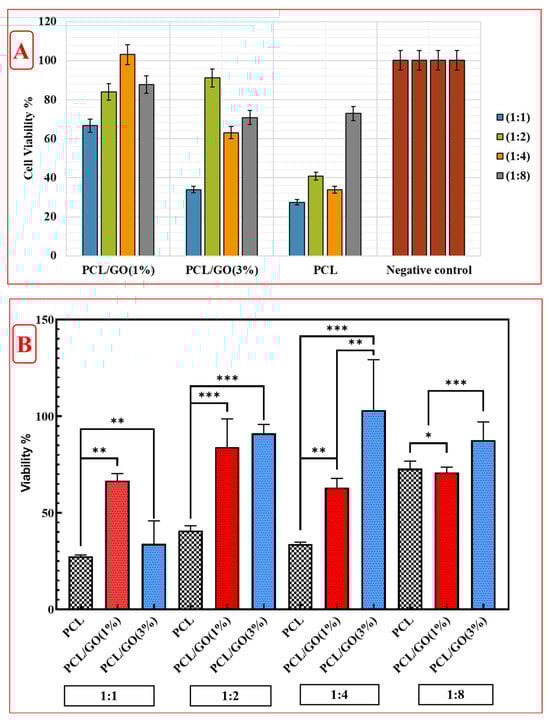 Cytotoxic activity of PCL and PCL/GO scaffolds. (A) L929 cells were treated for 24 h with four different concentrations of sterile samples: (1:1), (1:2), (1:4), and (1:8) via the indirect MTT method. (B) Cell viability of L929 cells after cytotoxicity tests of 3D composite scaffolds (*, **, *** the statistical significance level was determined as p < 0.05).