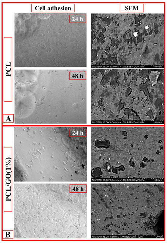 (A) 24 and 48 h cell adhesion–SEM images of the PCL scaffold. (B) 24 and 48 h cell adhesion–SEM images of the PCL/GO (1%) scaffold.