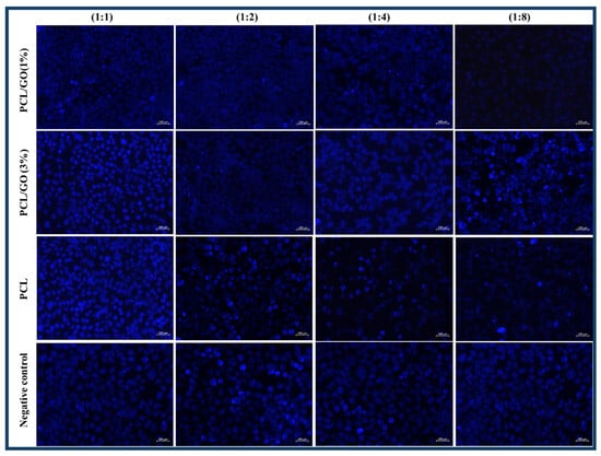 The cell density of PCL/GO (1%) and PCL/GO (3%) 3D meniscus scaffolds was observed to be higher, especially at 1:1 and 1:2 ratios (Figure 9). This may indicate that the designed scaffolds are suitable for cell adhesion and proliferation. While generally more dense cell adhesion was observed at a 1:1 ratio, it was observed that the cell density decreased as the ratio increased (1:4, 1:8). The shape and distribution of cell nuclei were quite regular in PCL and PCL/GO scaffolds [14,58,59]. This indicated that the surface was suitable for cell adhesion. The PCL/GO (3%) meniscus scaffold performed better than other groups regarding cell density and distribution. This may indicate the positive effect of GO on biomaterials [56,59].