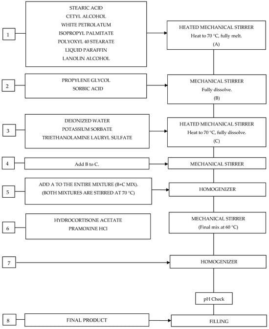 In pharmaceutical technology, the production of creams and ointments is based on the separate preparation and mixing of two phases, the water phase and the oil phase. An oil/water emulsion is prepared by mixing the phases. Since a smooth cream was desired to be obtained, the prepared cream was made smooth with a homogenizer. Finally, the pH was measured. The details of the production of the cream formulation, the contents of which are given in Table 3, are given in the production process flow chart below (Figure 2). The critical parameters of the production process were determined as the addition of active substances and excipients to the optimal phase, mixing speed and duration, temperature, and homogenization speed.