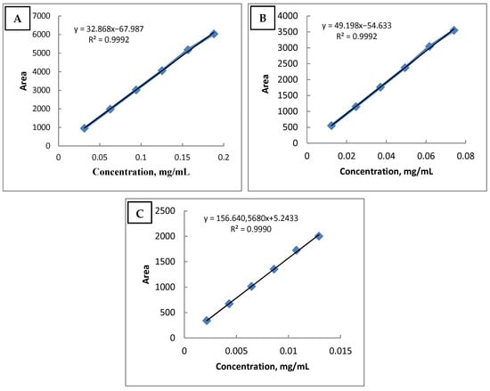 Hydrocortisone acetate (A), pramoxine HCl, (B) and antimicrobial preservative substance (sorbic acid) (C) linearity graph.