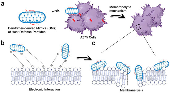 Scheme of the membranolytic mechanism of DMs against A375 cells. (a) Schematic representation of DMs. DMs destroy the membrane of A375 cells by inducing pore formation and membrane contraction. (b) DMs with cationic charges absorb the cell membrane via electronic interaction as the cancer cell membrane possesses negative charges. (c) DMs further insert into the cell membrane, causing pores as a consequence.