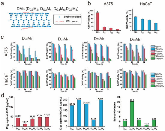 Cytotoxicity of dendronized polylysine core and DMs against A375 and HaCaT cells as determined by CCK-8 assay. (a) Schematic representation of DMs constructed by dendronized polylysine core and varying numbers of PCL arms. (b) Cell viability of A375 and HaCaT cells following treatment with dendronized polylysine core (256 μg/mL) for 72 h. (c) Cell viability of A375 and HaCaT cells treated with DMs at various concentrations and incubation times. (d) IC50 values of DMs against A375 and HaCaT cells and the selectivity index, calculated as the ratio of IC50 against HaCaT cells to IC50 against A375 cells.