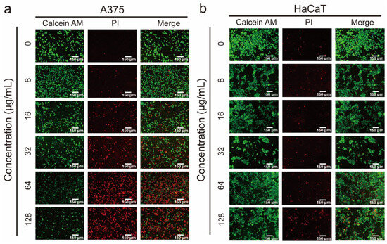 Concentration-dependent live/dead staining analysis of DMs against A375 (a) and HaCaT cells (b). Cells were treated with DMs at concentrations of 0, 8, 16, 32, 64, and 128 μg/mL for 6 h.