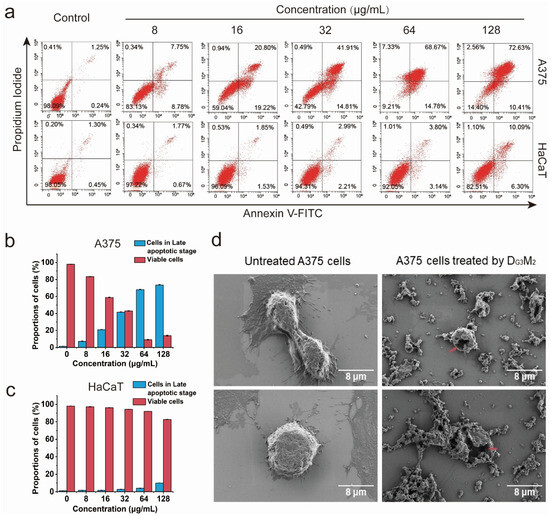 Flow cytometry with annexinV-FITC/PI double staining was utilized to distinguish viable, early apoptotic, late apoptotic, and necrotic cells following DG3M2 treatment (Figure 4a). As shown in Figure 4b, the results demonstrated a significant reduction in the proportion of viable A375 cells, decreasing from 83.4% ± 0.27% to 14.0% ± 0.55% as the DG3M2 concentration increased from 8 μg/mL to 128 μg/mL. Most affected cancer cells were classified as late apoptotic, with their proportion rising from 7.23% ± 0.46% to 73.5% ± 0.85%. In contrast, early apoptotic and necrotic cells consistently remained at low levels across all concentrations. For HaCaT cells (Figure 4c), the proportion of viable cells remained as high as 82.51%, even at the maximum concentration of 128 μg/mL, supporting the observed selectivity of DG3M2.