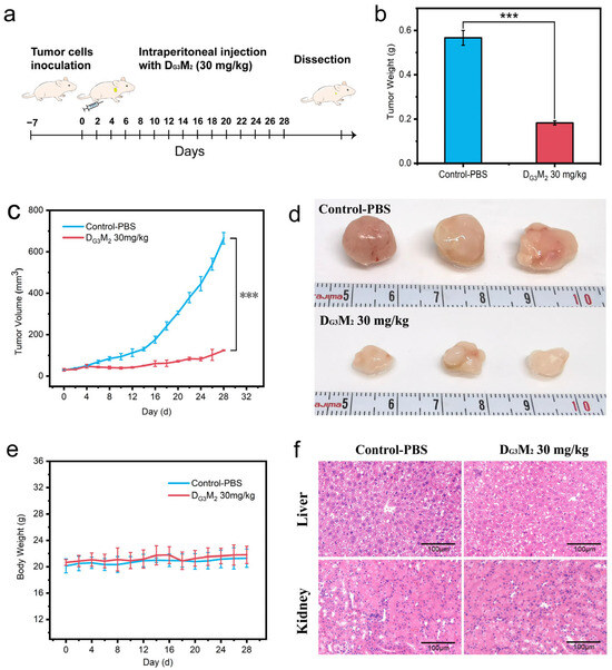 Once the average tumor volume reached approximately 30 mm3, the mice were randomly divided into two groups (n = 3 per group). One group received intraperitoneal injections of DMs (10 mg/kg in PBS), while the control group received an equivalent volume of PBS. Injections were administered every two days for a total of 28 days. Body weight and tumor dimensions were recorded before each injection to monitor systemic toxicity and tumor progression. At the end of the treatment, mice were euthanized humanely, and tumors were excised and weighed. Tissues were fixed in 4% paraformaldehyde, embedded in paraffin, sectioned, and stained with hematoxylin and eosin (H&E) for histopathological evaluation to assess systemic toxicity.