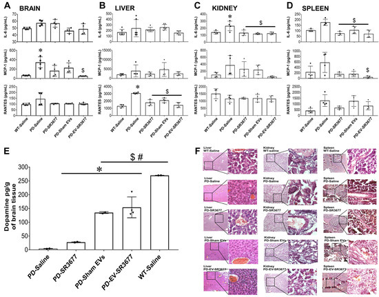 Since inflammation plays a key role in the pathology of PD [43], the secretion levels of inflammatory molecules in the brain and other organs were measured by ELISA (Figure 2). The production of MCP-1 increased 5-fold in the brains (Figure 2A), 2-fold in the livers (Figure 2B), 4-fold in the kidneys (Figure 2C), and 3-fold in the spleens (Figure 2D) of PD mice treated with saline, compared to the results for the healthy (wild-type) animals. The expression of RANTES in the livers (Figure 2B) and IL-6 in the spleens (Figure 2D) was significantly higher in PD mice treated with saline than in healthy (wild-type) animals. Treatment with EV-SR3677 reduced MCP-1 expression in the brains (Figure 2A), kidneys (Figure 2C), and spleens (Figure 2D) by 7-, 9-, and 12-fold, respectively, compared to the results for similar organs from PD mice treated with saline. Although the levels of inflammatory molecules in the livers and spleens of PD mice treated with saline were elevated, minimal morphological changes were observed in these tissues, as assessed by H&E (Figure 2F). Lastly, dopamine levels in the anterior brain region (including the striatum) were quantified using the liquid chromatography–tandem mass spectrometry (LC–MS/MS) method (Figure 2E). The linearity of the dopamine method was evaluated with a calibration curve constructed over the range of 5–500 pg/mL (Supplemental Material Figure S1). The dopamine concentration was low in the brains of PD animals treated with saline, while treatment with EV-SR3677 significantly (p < 0.001) increased dopamine levels to those of healthy (WT) animals exposed to saline (Figure 2E: last two columns).