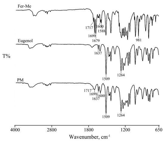 FT-IR spectroscopy was used to evaluate the interactions of Fer-Me in eugenol. The spectra obtained are reported in Figure 1. The stretching and bending bands characteristic of Fer-Me and eugenol functional groups can be clearly identified.