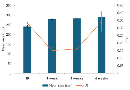 NEs were stored at 4 °C for four weeks to evaluate the physical stability of the developed formulation. The mean size of three batches of NEs was analyzed after preparation (t0) and after 1, 2, and 4 weeks of storage. Observing the graph in Figure 2, NEs exhibited an initial mean particle size of approximately 242 nm (t0) with a PDI of 0.33, indicating good uniformity. After one week, it was possible to notice a slight increase in particle size to 282 nm, accompanied by a decrease in PDI to 0.15, suggesting an improvement in size homogeneity, likely due to initial stabilization or reorganization of CS-OA micelles. From the second week onwards, the particle size was maintained constantly, revealing an average size of approximately 293 nm, which was recorded by the third week. In spite of a slight increase up to 0.34, PDI was maintained below 0.5 for all storage times, indicating good homogeneity.