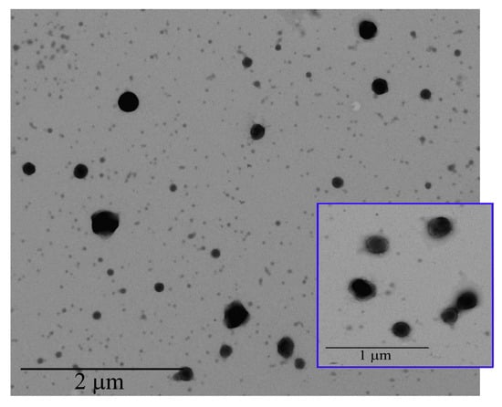 TEM analysis was performed to characterize, in terms of morphology, the CS-OA NE formulations (Figure 3). The internal phase of the NE appeared as spherical droplets with an average size of 250 nm, confirming PCS analysis data. In the higher magnification it is possible to observe a shell around the droplets due to the presence of surfactant in the o/w interface.