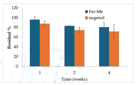 Results of the residual % content of Fer-Me and eugenol after 1, 2, and 4 weeks of storage at 4 °C (mean ± SD). Statistical significance was found for the Fer-Me after 4 weeks vs. 1 week only (ANOVA and Fisher’s least significant difference (LSD) procedure, p < 0.05).