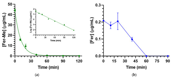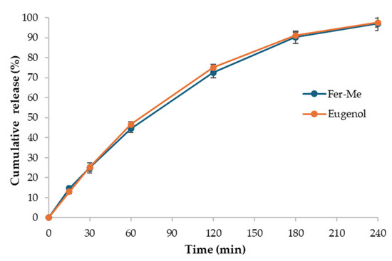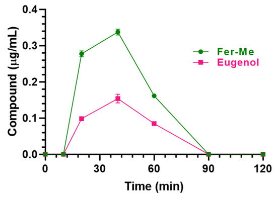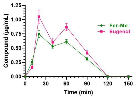 The AUC values were 48.89 ± 1.30 µg∙mL−1∙min and 63.75 ± 2.18 µg∙mL−1∙min for Fer-Me and eugenol, respectively (Table 2).
