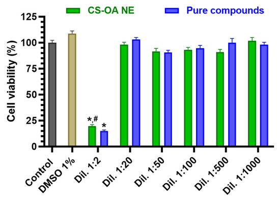 Cell viability of RPMI 2650 cells incubated with different dilutions of CS-OA NE or the corresponding combined solutions of pure compounds (starting from an approximated concentration of 5 mM Fer-Me and 12 mM eugenol in the not-diluted formulation). Data of MTT assay are presented as cell viability percentage (%) normalized to control (in the absence of compounds) and expressed as mean ± S.E.M. of three independent experiments run in duplicate (n = 6). Statistical comparisons vs. control were obtained using two-way ANOVA followed by Dunnett’s multiple comparisons test (* p < 0.0001 vs. control). Statistical comparisons within the same dilutions were performed by unpaired t-test (# p < 0.05 CS-OA NE vs. pure compounds).