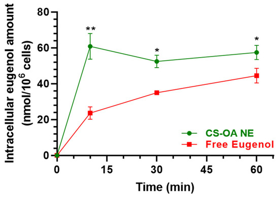 Figure 7 reports the intracellular uptake profiles in the RPMI 2650 cells of eugenol incubated as loaded in CS-OA NE formulation or as a pure compound in a combined solution with Fer-Me. CS-OA NE allowed us to immediately reach an intracellular eugenol amount of 60.80 ± 5.09 nmol/106 cells, a value that became stable within 60 min (57.41 ± 2.80 nmol/106 cells). On the other hand, when eugenol was incubated as a free compound, its intracellular amount was 23.61 ± 2.45 nmol/106 cells after 10 min and increased to 44.49 ± 2.91 nmol/106 cells within 60 min, indicating a time-dependent eugenol uptake. At all tested time points, the intracellular amounts of eugenol following the pure compound incubation were significantly lower than those obtained following the incubation of CS-OA NE. These results indicate that CS-OA NE formulation allows the improvement of the eugenol uptake in RPMI 2650 cells, suggesting its potential ability to act as a permeability enhancer for this compound across the nasal mucosa. To support this hypothesis, CS-OA NE allowed us to obtain an uptake efficiency at 10 min of 0.77 ± 0.10%, whereas the uptake efficiency of free eugenol at 10 min was 0.26 ± 0.03%, a value which is about three times lower than that of CS-OA NE (p < 0.01).