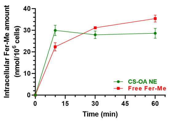 Considering this result, CS-OA NE was subsequently used for RPMI 2650 cell uptake assay at 1:20 v/v dilution. The results were then compared to those obtained by incubating RPMI 2650 cells with a solution containing Fer-Me/eugenol at the same concentrations as CS-OA NE.