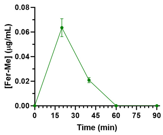 Fer-Me rat CSF concentration following intravenous administration was 0.064 ± 0.007 µg/mL 20 min after the end of infusion and then decreased to zero within 60 min (Figure 10). The total AUC value was 1.69 ± 0.15 µg∙mL−1∙min (Table 1). The comparison with the pharmacokinetic data of Fer and eugenol in the CSF of rats [11,20], reported in Table 1, indicates that the aptitude of Fer-Me to permeate into the CNS from the bloodstream is poor in comparison to Fer and negligible in comparison to eugenol.