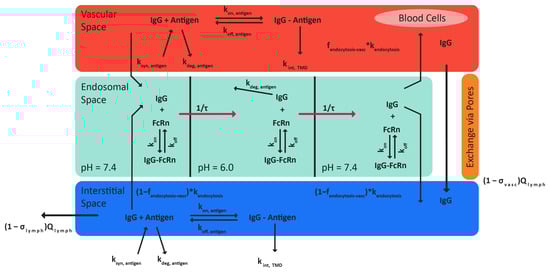Clearance can either occur as a result of unsuccessful binding to the neonatal Fc receptor (FcRn) and subsequent lysosomal degradation or through internalization of the antigen–antibody complex if applicable. The endosomal subspace is divided into three compartments to capture the change in pH with the formation of the endosome that results from uptake of the large molecule. Since binding to the FcRn is pH-dependent, it is important to account for pH differences. The first endosomal subspace represents the initial uptake of the large molecule by endocytosis when the endosome has not been completely formed. At this point, the environment has a pH of 7.4 which is associated with lower binding affinity between the antibody and the FcRn. The second endosomal subspace represents the complete formation of the endosome with a pH of 6 [13], associated with higher binding affinity between the antibody and the FcRn. It is in this compartment that clearance of the antibody can occur (degradation by the lysosome) if the antibody does not successfully bind to the FcRn [14]. The third endosomal subspace represents the recycling of the antibody back to the cell surface. The pH of this compartment is 7.4, allowing the antibody to unbind from the FcRn and be recycled back to the vascular or interstitial space. If the drug binding to the target antigen impacts the drug’s PK, the processes associated with target-mediated drug distribution (TMDD) may be included in the model. Separate dynamics for antigen synthesis and degradation and tissue-specific antigen expression are incorporated, as well as binding dynamics of the antibody and antigen. Antibody bound to the antigen can be cleared through internalization of the complex [15].