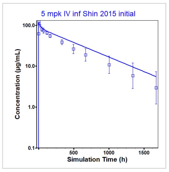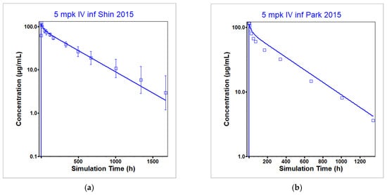 The PBPK model for infliximab was generated in a step-wise process. The initial model prediction of the optimization dataset in Shin et al. [28] showed an underprediction of clearance (Figure 2). In order to fit to the observed data in [28], the rate at which infliximab unbinds from FcRn in pH 6 was increased from the default value of 500 per day to 800 per day. Higher unbinding led to increased clearance by lysosomes as the compound is not able to benefit from the protective effect of binding to FcRn to prevent lysosomal clearance. This single modification reproduced the observed data best across both available NHV clinical datasets [28,43] and, therefore, was chosen to be included in the final model. This modification was supported by in vitro data in [44]. The result of the optimization to [28] is given in Figure 3a with the model validation to a secondary dataset containing plasma concentration time profiles after an IV infusion in normal healthy individuals [43] in Figure 3b. Note that all infliximab concentrations were measured using an ELISA that quantified concentrations by measuring binding to TNF-α. Therefore, all measured concentrations are assumed to be unbound (not total) infliximab concentrations and were predicted as such within GastroPlus. However, in the case of infliximab at the dosing levels represented in the data and using the TNF-α concentrations reported in the literature, simulated total infliximab plasma concentrations equaled unbound plasma concentrations. See Table 7 (rows 1 and 2) for the simulated and observed PK parameters for the final model in healthy individuals. All simulated PK parameters (Cmax and AUC) fell within bioequivalence limits (BE, 0.8–1.25) of the observed PK parameters for both optimization and validation datasets.